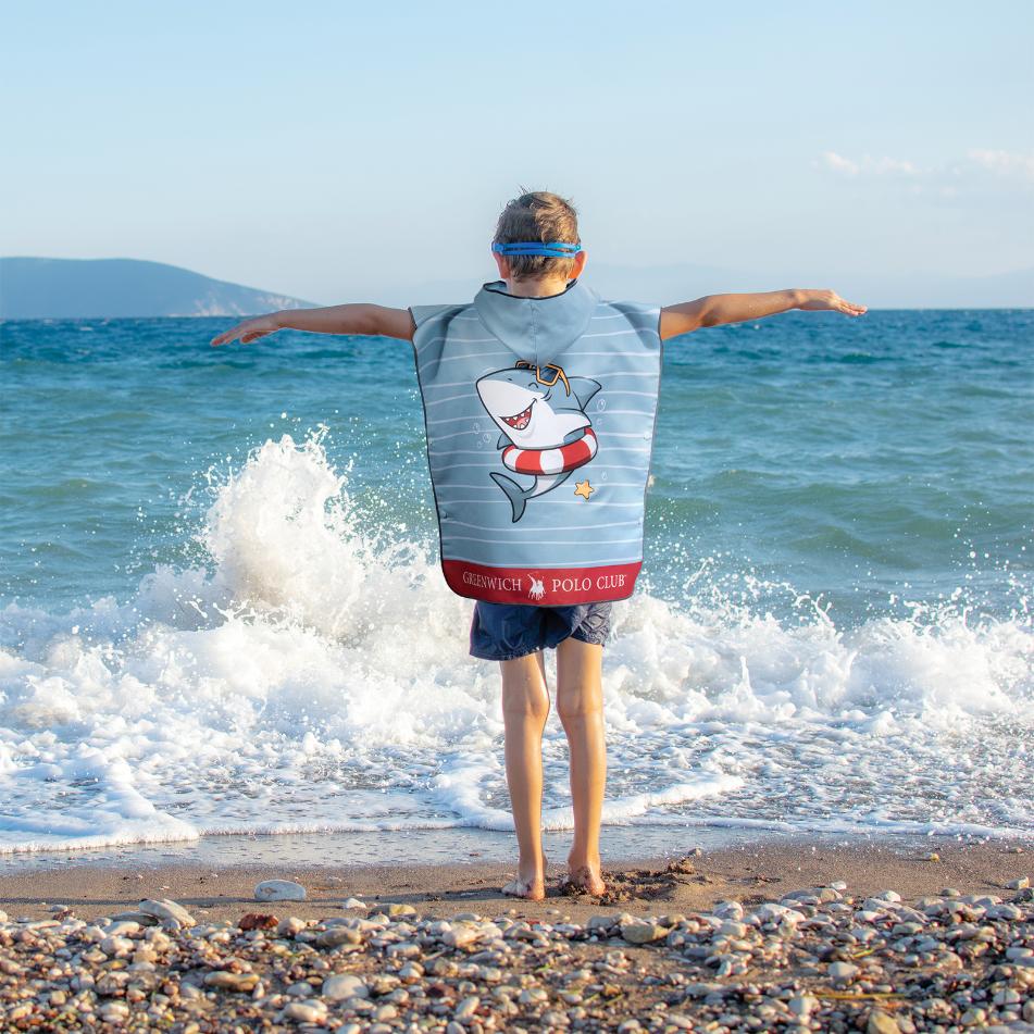 Make beach time fun and comfortable with the Shark Polo Junior 2-Side Printed Beach Poncho. Designed for kids, this playful poncho features a shark-themed double-sided print and is made from soft, absorbent fabric to keep your child cozy and dry after swimming. The 50 x 115cm size is perfect for juniors, lightweight, and easy to wear. Ideal for beach days, pool fun, or holidays, it protects from sun and wind while adding a touch of fun to summer adventures.